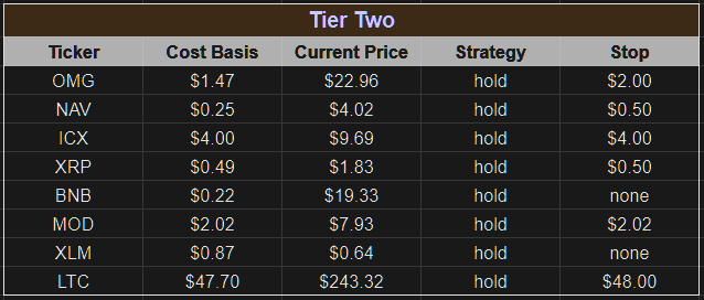Tier 1 coins are those coins which we have considerable assets invested, are firm believers in the project direction and execution, and have very little reason to sell within short to mid term. These are coins which we risk evaluated to be very solid, and have a high probability of existence duration.