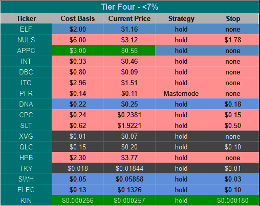 Tier 1 coins are those coins which we have considerable assets invested, are firm believers in the project direction and execution, and have very little reason to sell within short to mid term. These are coins which we risk evaluated to be very solid, and have a high probability of existence duration.