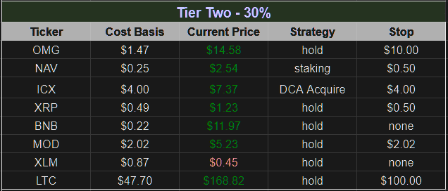 Tier 1 coins are those coins which we have considerable assets invested, are firm believers in the project direction and execution, and have very little reason to sell within short to mid term. These are coins which we risk evaluated to be very solid, and have a high probability of existence duration.